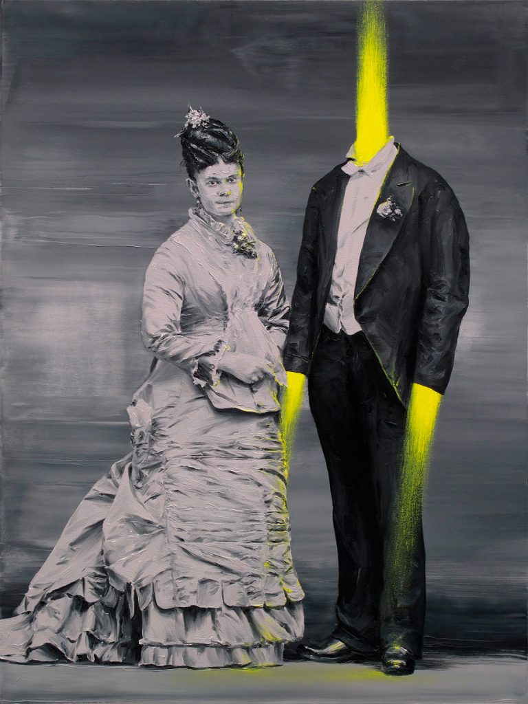 Paco Pomet (Granada, 1970) El punto de partida en su proceso de creación, como es habitual en su producción, son fotografías documentales fechadas a principios del siglo pasado. A partir de ellas, haciendo uso de su pincel y su subconsciente, las transforma incorporando elementos extraños a su sentido documental original. Elementos que suman ironía o sentido crítico y que hacen que las canónicas imágenes primeras adquieran nuevos significados o no adquieran ninguno después de que el absurdo y el misterio hayan podido con ellas. En la mayor parte de sus obras, es el espectador quien debe decidir, o especular, qué es lo que contempla: él, y no el artista, es en este caso responsable de concederles un sentido más o menos narrativo o una intención. Uno de los recursos más cultivados por Pomet en este propósito de convertir una imagen documental en una obra propia, irónica y críptica, es la alteración del orden de los elementos de la escena de la que parte, generando una composición radicalmente distinta, una “realidad” nueva que no es tal realidad sino el fruto de un proceso creativo marcado por la imaginación. Pero no siempre es ese su método, este varía en función del contexto de las obras originales y de lo que estas sugieran al artista. En palabras de Pomet “la sensación de extrañeza que a veces experimento cuando observo muchas de las escenas descritas en fotografías vintage se amplifica enormemente cuando añado cambios a la imagen original. Estos cambios pueden ser estructurales, tonales, compositivos o pueden consistir sencillamente en la sustitución, eliminación o adición de algún elemento, a veces muy pequeño, que desarma completamente la imagen originaria de la que parto para construir mis obras.”