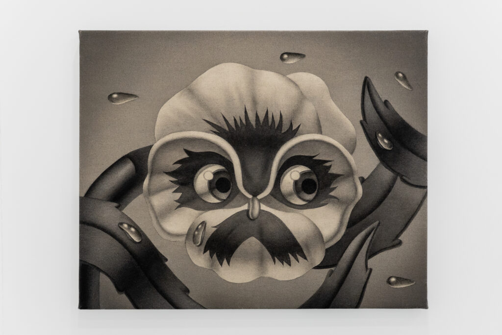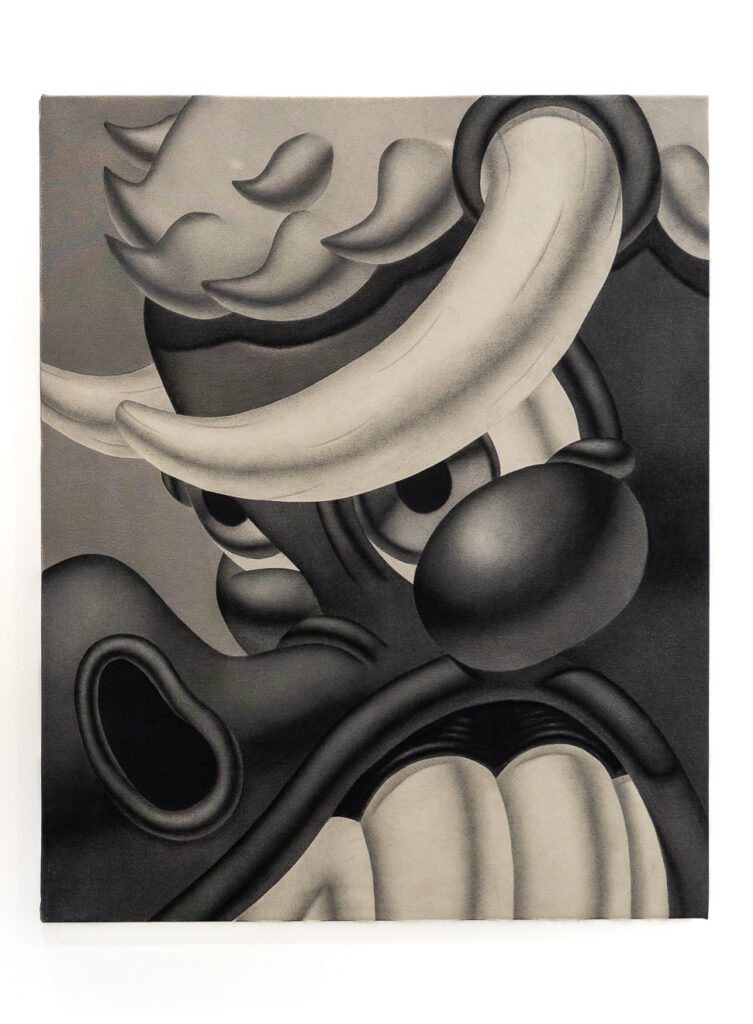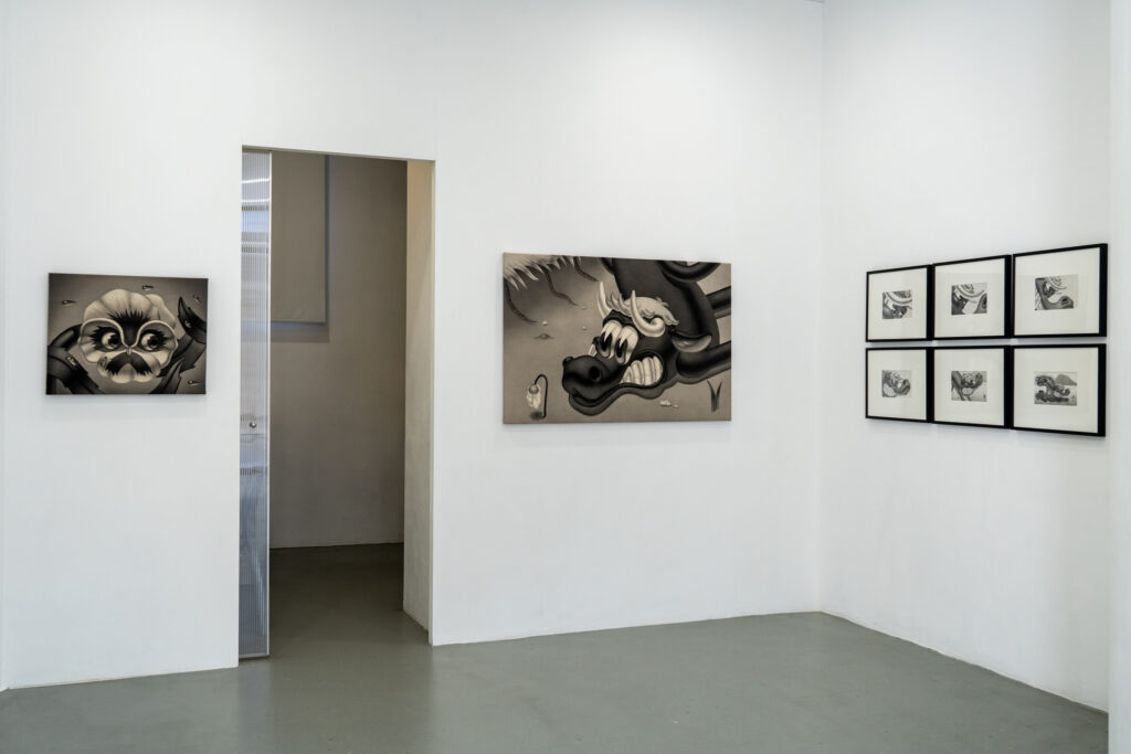 His practice revolves around drawing on paper and canvas —graphite, charcoal, and conté— and is part of a genealogy of artists who champion the raw and the emotional as a visual language, in tune with international figures such as Raymond Pettibon and Chloe Piene. Tinoco’s imagery, populated by distorted beings and fragmented narratives, reflects a generation marked by emotional overexposure, black humor, and the aesthetics of the absurd.
