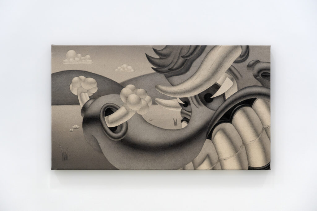 Abanto (Timid bull) is Fernando Tinoco’s first solo exhibition at SC Gallery, consolidating a collaboration that opens up new avenues of artistic exploration. The exhibition offers an immersion into a hybrid, mythological, and dreamlike universe, where contemporary tensions between sensitivity and violence are revealed through two-faced creatures and compositions that evoke the ancestral and the molecular. Tinoco constructs a worldview that connects the visible with the invisible, the spiritual with the biological.